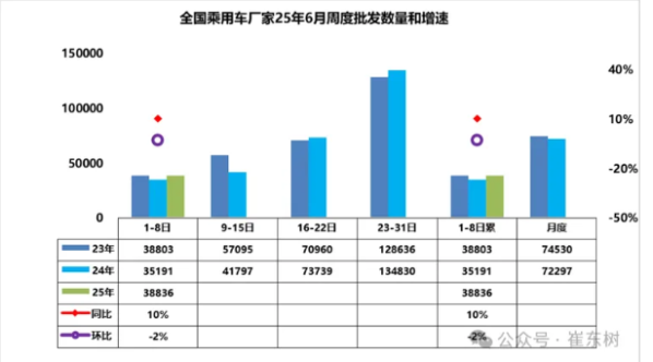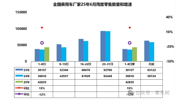 【智车派新闻】据乘联会秘书长崔东树消息,2025年6月1日至8日,全国乘用车市场延续了上半年的增长势头,批发与零售端均实现双位数同比增长,新能源车型渗透率再创新高,成为推动车市整体上扬的核心动力。